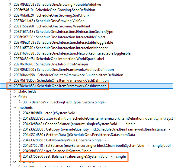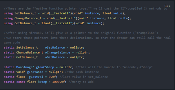 Unity (Mono) has the game logic as IL inside "Assembly-CSharp.dll". Like our explanation above, when the method CashInstance.set_Balance is first used, the Mono JIT compiles it into native code in memory. Therefore, we're setting up the typedefs to call the JIT-compiled C# methods, and the globals/states (like the captured instance, the cash value, and them sizes and flags).