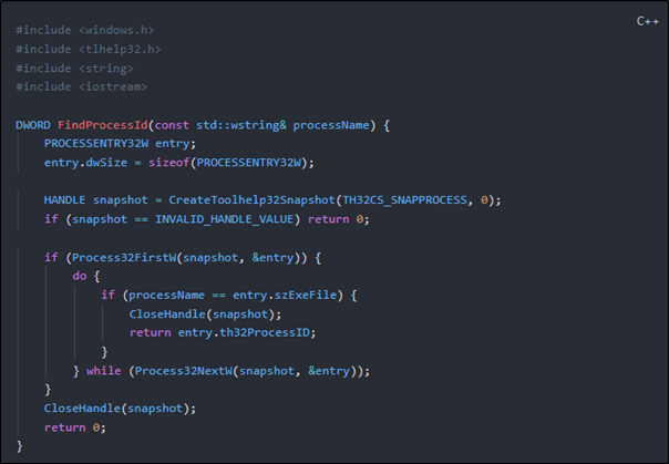 To start the injection, the injector first needs to locate the target process. Using CreateToolhelp32Snapshot, it takes a snapshot of all running processes. The injector then loops through this snapshot, checking each entry until it finds the process with the matching name.
