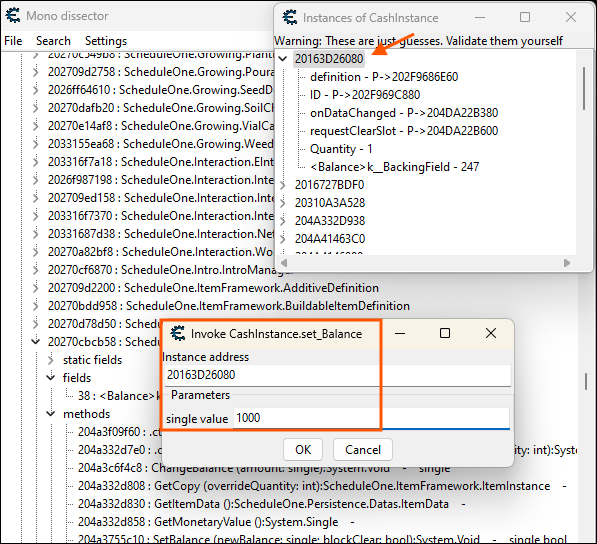To validate whether this is the right location, we can right click on the fully qualified method name of "ScheduleOne.ItemFramework.CashInstance" and find instances of the class. Many instances would pop up, but we must pinpoint to the one that's holding the value of our cash.