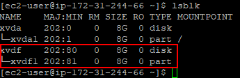 We can verify that the volume has been attached by issuing the lsblk command in our EC2 instance: