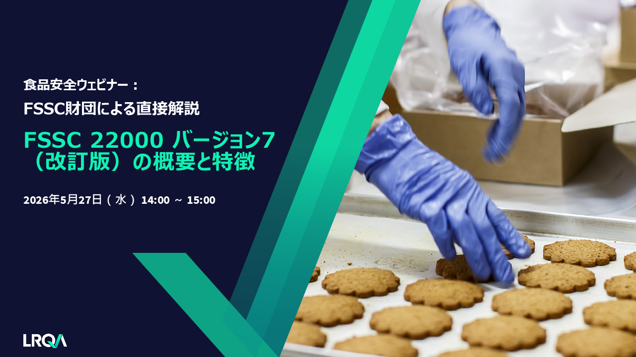 この度 LRQA は、5月27日(水)に FSSC 財団 日本代理人の出田 宏 氏を講師としてお招きし、2026年5月に正式発行された改訂版 FSSC 22000 バージョン7 の概要と特徴を分かりやすく解説する無料ウェビナーを開催します。