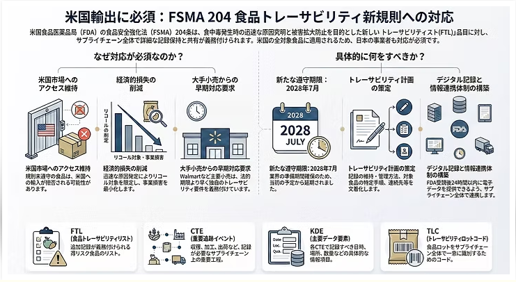 - 米国・食品安全強化法FSMA第204条に基づくFTRの要件を体系的に理解し、FDA査察・取引先からのトレーサビリティ要求に対応できる実務対応力が身につきます。