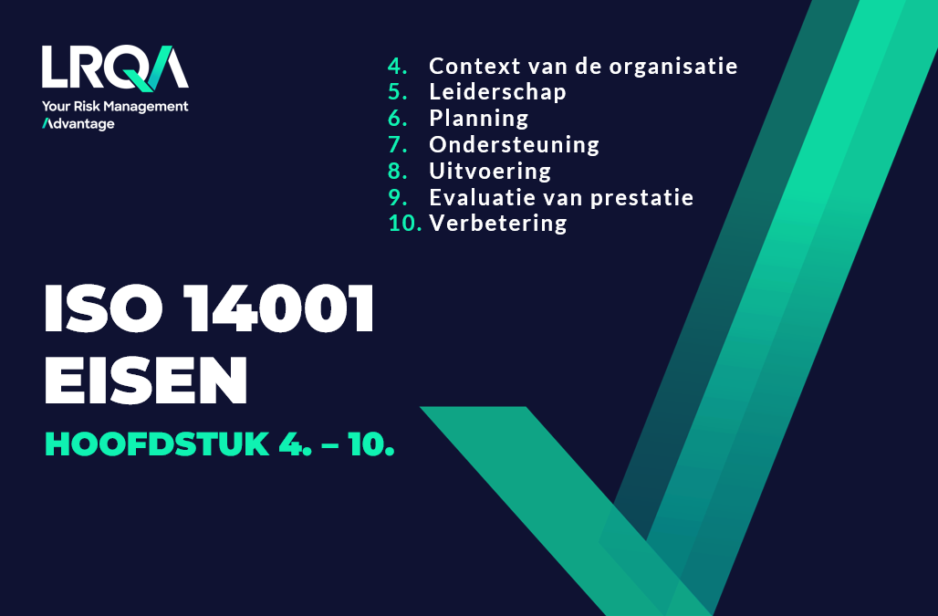 De ISO 14001 norm is onderverdeeld in tien hoofdstukken, volgens de High Level Structure. De eerste drie delen bevatten inleidende informatie, terwijl de delen vier tot en met tien betrekking hebben op de eisen voor een milieumanagementsysteem.